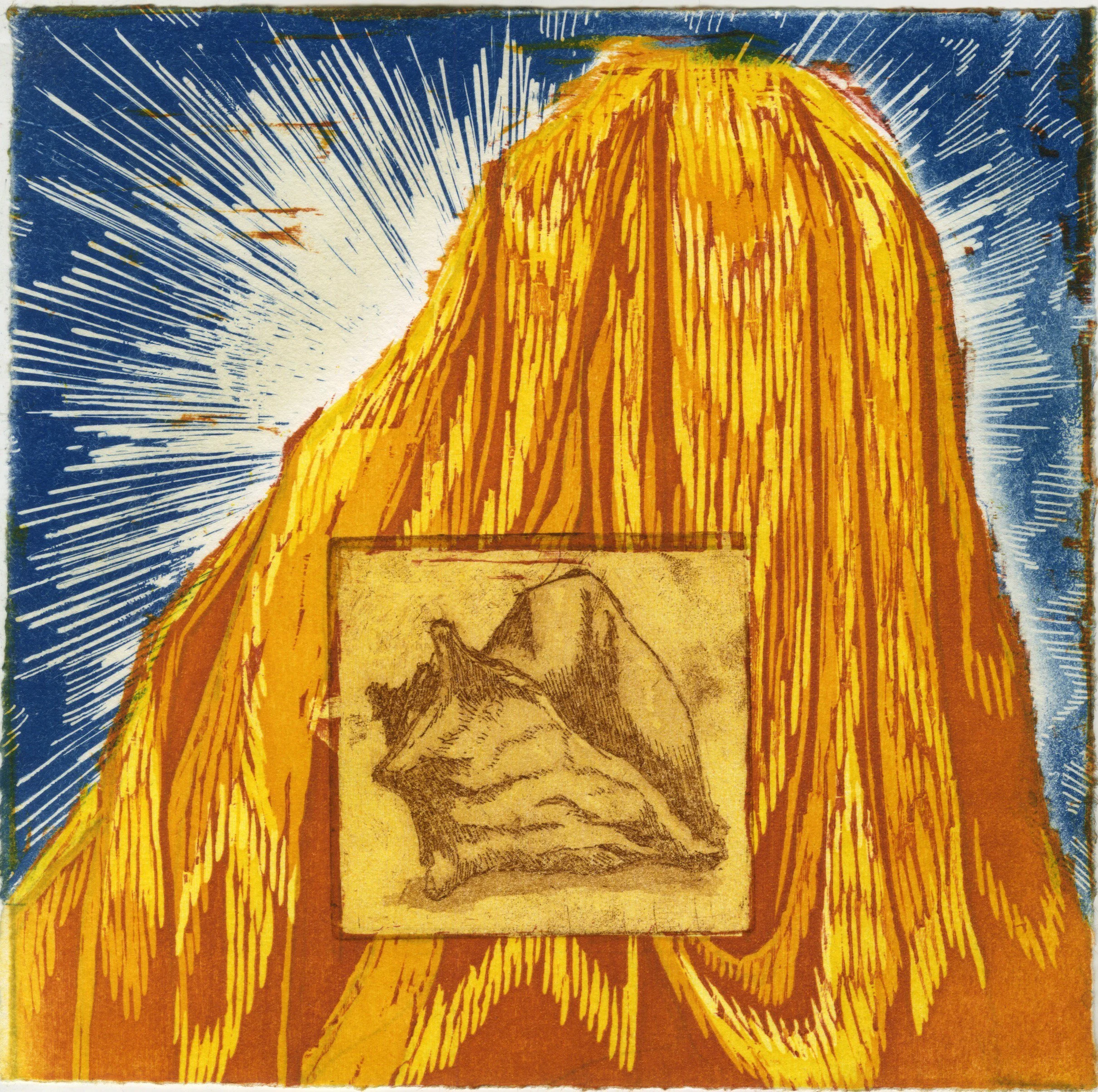 untitled (shroud), 6”x10”. cyanotype and reduction woodcut. var. ed. of 4. 2025.